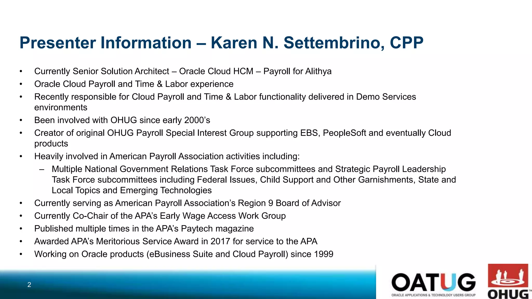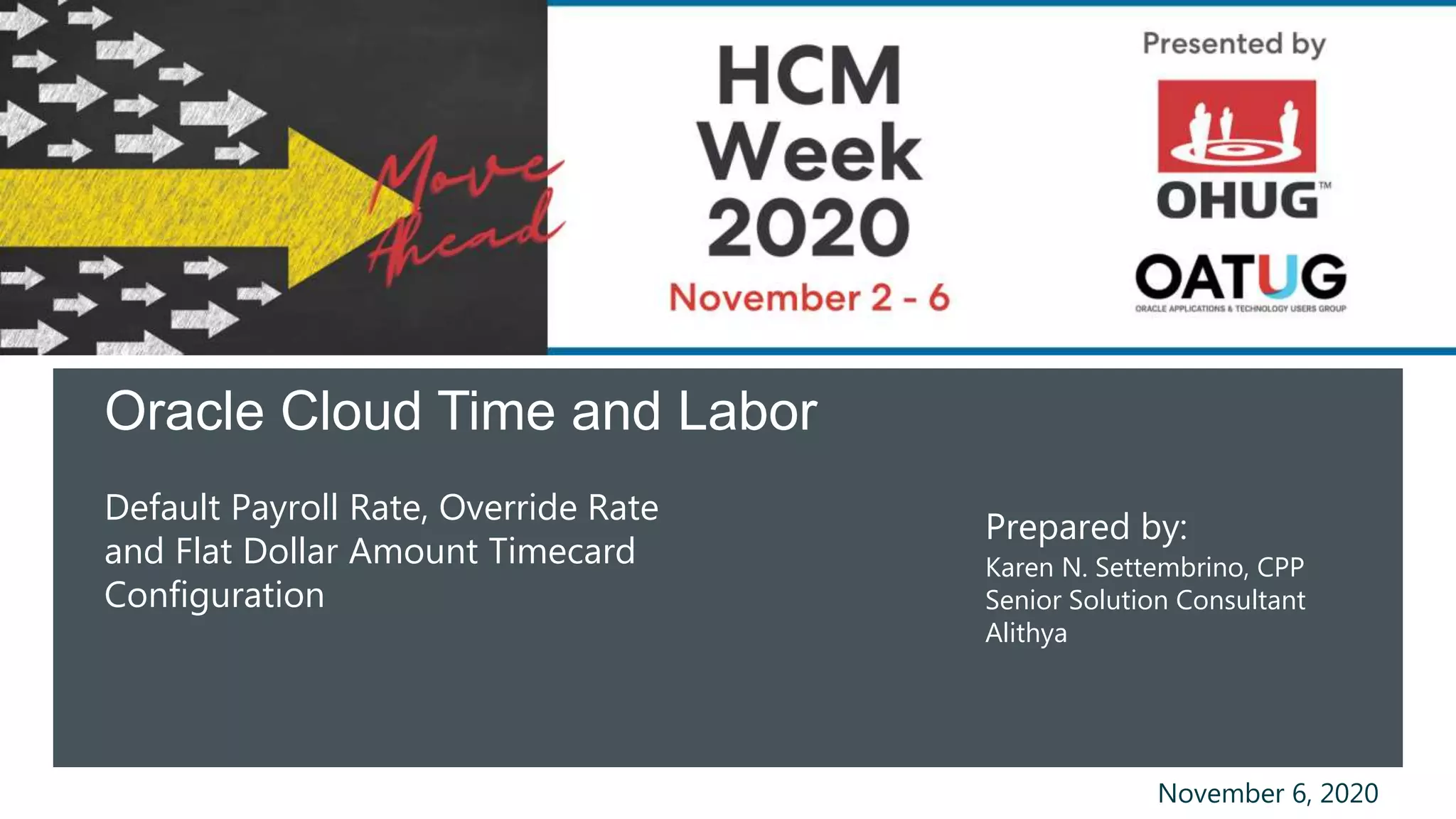 The document outlines the configuration process for the Oracle Cloud Time and Labor module, focusing on default payroll rates, override rates, and flat dollar amount timecard entries. It details the necessary setup steps for managers to manage employee pay effectively, including creating new elements and defining rate calculations for accurate payroll reporting. The author, Karen N. Settembrino, CPP, shares her extensive experience and involvement in the payroll field, underscoring the importance of compliance and accurate data handling in payroll systems.