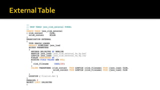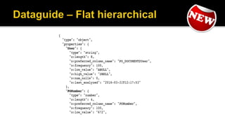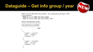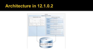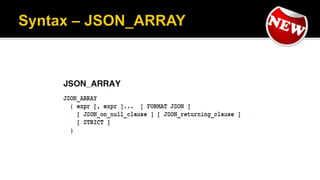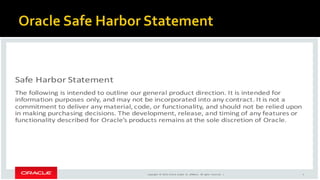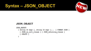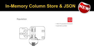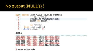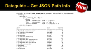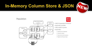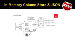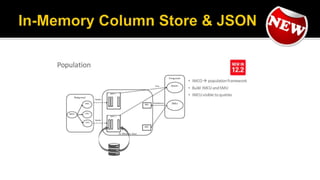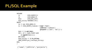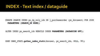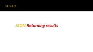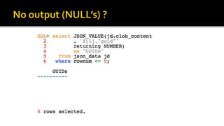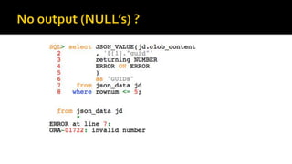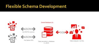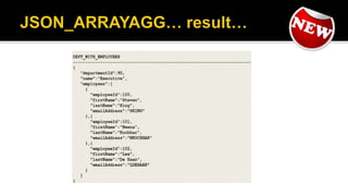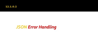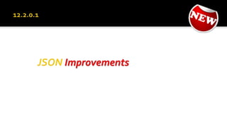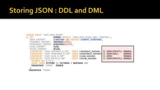 The document outlines the capabilities of Oracle Database regarding JSON data management, particularly in versions 12.1.0.2 and 12.2.0.1. It discusses features such as storing, indexing, querying JSON documents, new JSON functions, and the implementation of JSON path expressions, along with performance improvements through various enhancements. Additionally, it highlights the importance of JSON schema specifications, validation, and integration with PL/SQL and other Oracle functionalities.