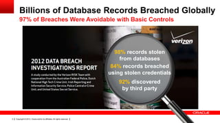 The document discusses security issues with databases and Oracle's database security solutions. It notes that 97% of breaches were avoidable with basic controls, 98% of records were stolen from databases, and 84% of records were breached using stolen credentials. Oracle provides database security solutions like encryption, activity monitoring, auditing, and privileged user controls to help prevent breaches through a defense-in-depth approach.