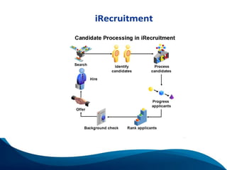 The document discusses the features and functions of a talent management software, including recruitment, core HR, payroll, self-service, performance management, succession planning, talent profiling, suitability matching, and employee succession information. It provides details on using suitability analyzer to view competency ratings for workers, 9-box matrices for potential and retention, and viewing complete talent information for workers.