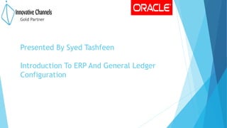The document introduces Enterprise Resource Planning (ERP) and emphasizes its components, particularly Oracle Financials and General Ledger. It outlines the key elements of the General Ledger, such as chart of accounts, currencies, and the accounting calendar, as well as the steps for their configuration. The document serves as a guide for understanding ERP systems and the setup of Oracle's financial modules.