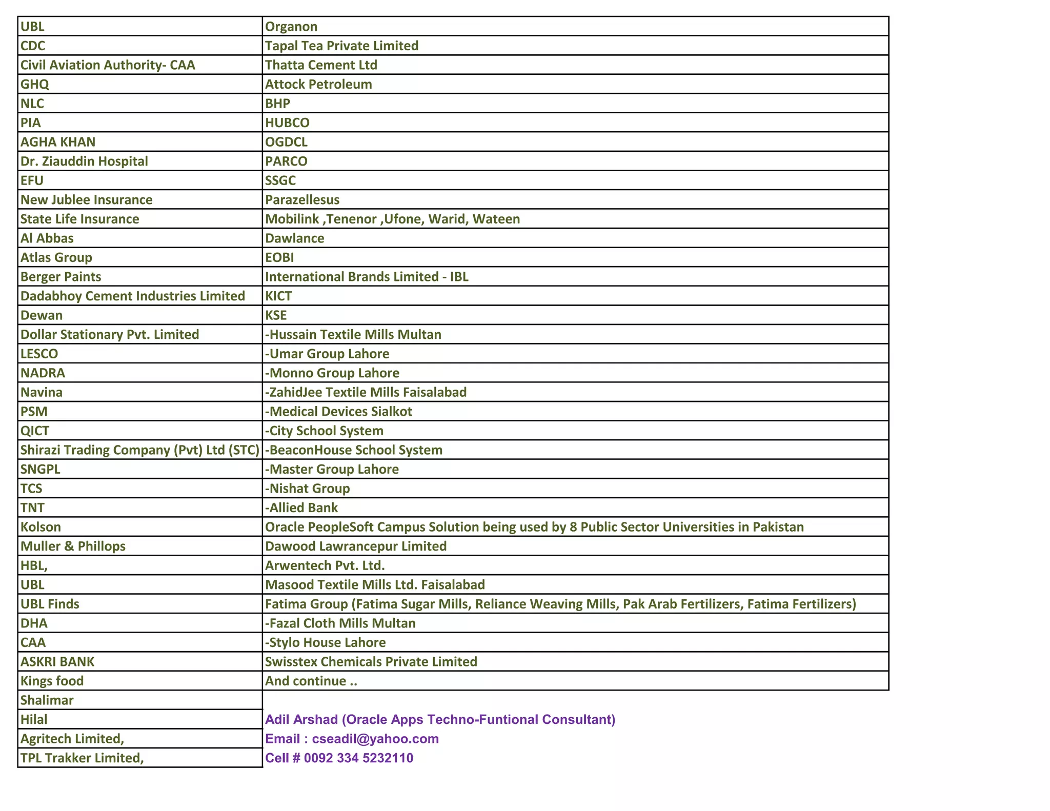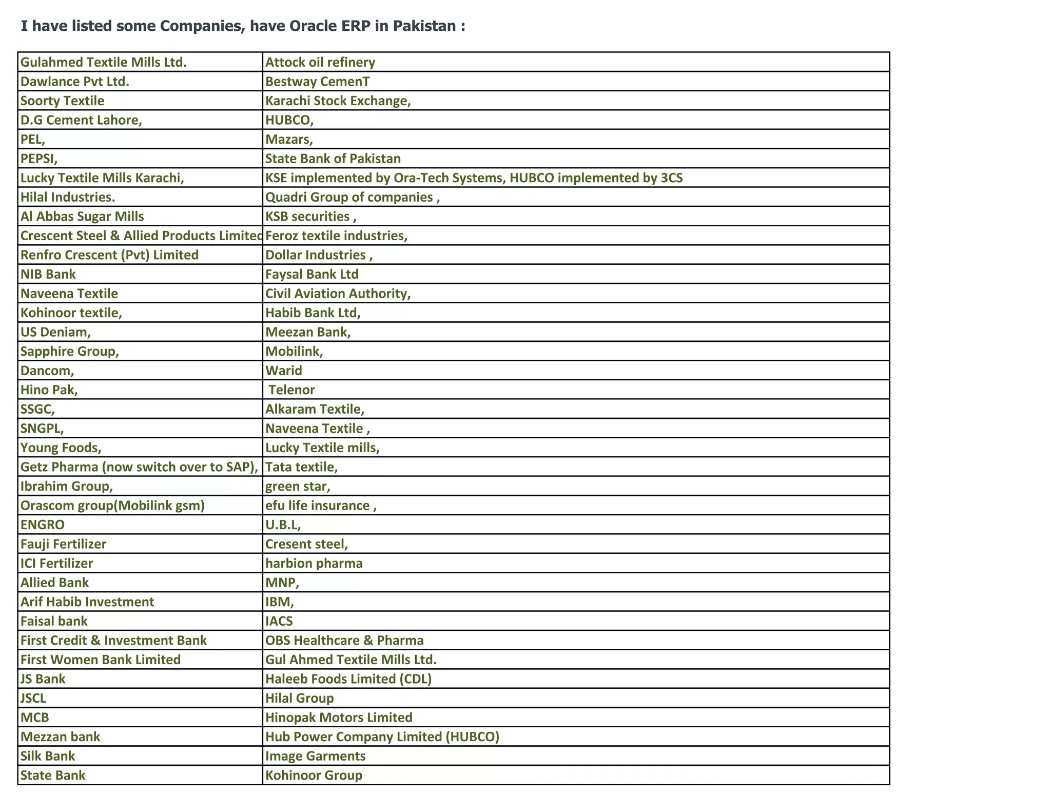 The document lists various companies in Pakistan that utilize Oracle ERP systems across multiple industries, including textiles, banking, oil, and cement. Notable organizations include Gul Ahmed Textile Mills, Attock Oil Refinery, and Pepsi. Additionally, it mentions the implementation of Oracle's PeopleSoft Campus Solution at eight public sector universities in Pakistan.