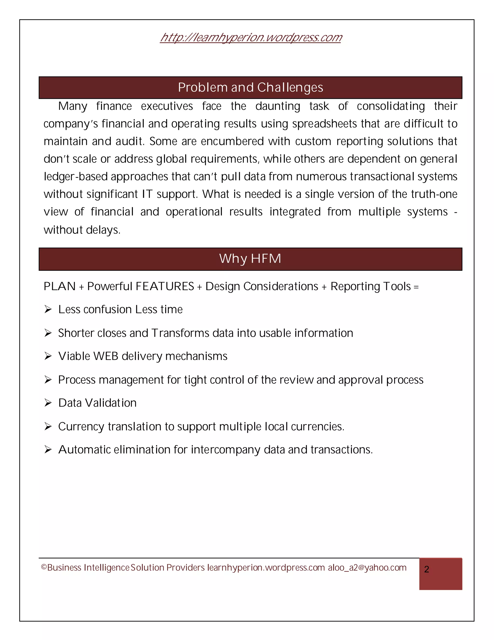 This document provides an overview of Oracle Hyperion Financial Management (HFM). It discusses how HFM can help companies consolidate financial data from multiple sources into a single reporting system. It also describes the key components and architecture of HFM, including its use of dimensions to organize data, the consolidation process, and financial reporting capabilities. HFM allows companies to load data, perform calculations and adjustments, translate currencies, consolidate results, approve data, and generate reports on an established financial cycle.