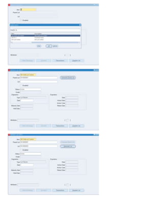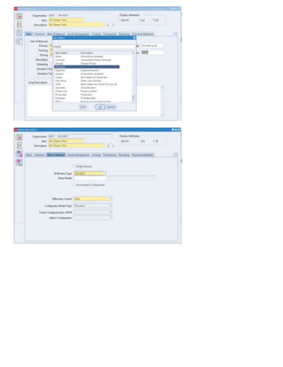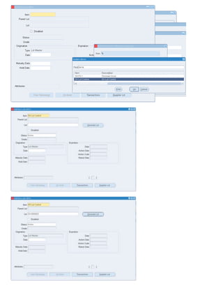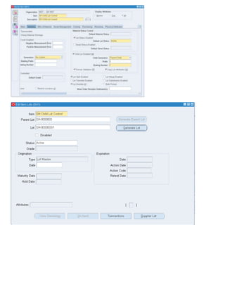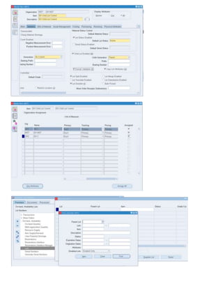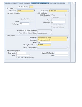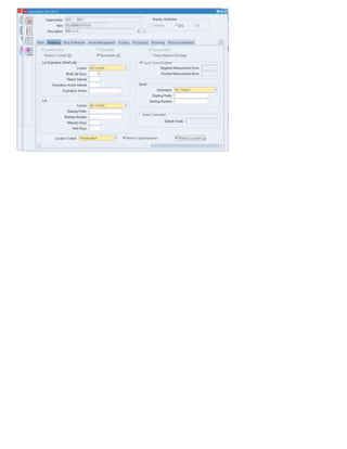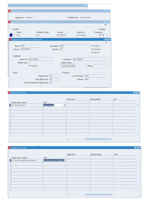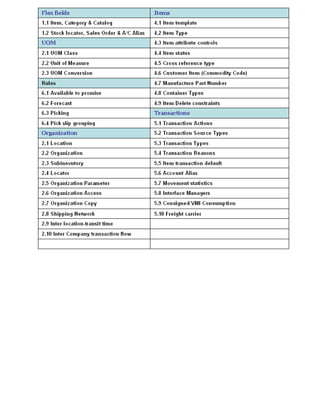 Oracle Inventory is one of Oracle's enterprise applications products that enables companies to define part numbers, model organization structures, track perpetual inventory, maintain accurate on-hand balances, plan material replenishments, and forecast anticipated demand. It provides several key flexfields including system items, item catalogs, item categories, stock locators, and account aliases. The flexfields must be designed and configured before implementing inventory functionality in Oracle.
