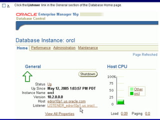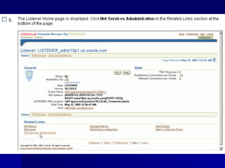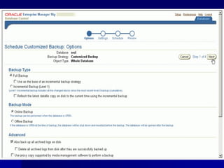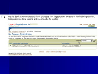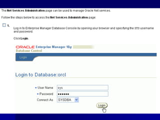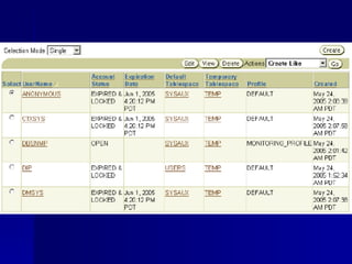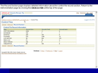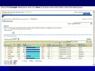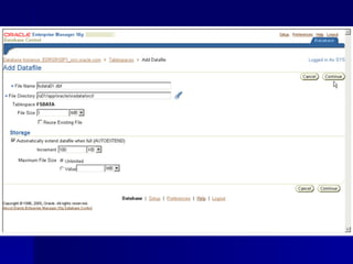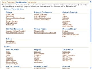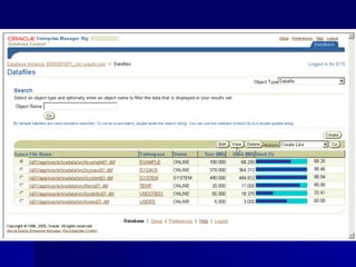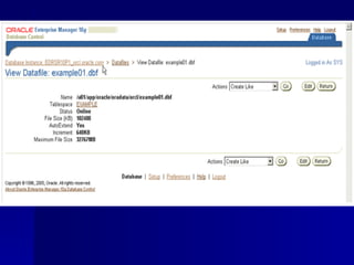 An RDBMS stores all data in two-dimensional tables composed of rows and columns, enabling users to store, update, and efficiently retrieve data. Common RDBMS examples include MS Access, Oracle, IBM DB2, Microsoft SQL Server, and MySQL. Oracle Enterprise Manager is a web-based tool for managing Oracle databases. The CREATE DATABASE statement shown creates a new database named "mynewdb" that defines users, log and data files, and tablespaces.