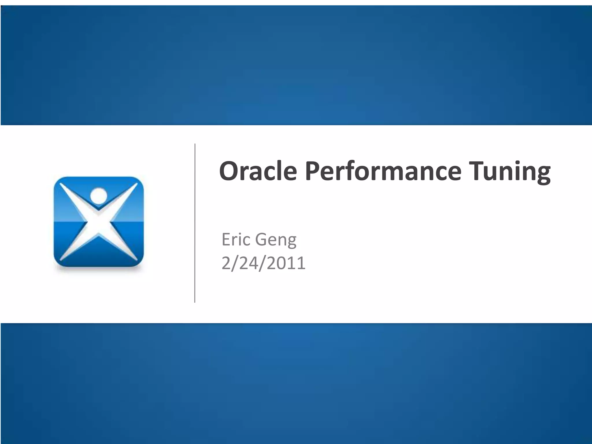 This document provides an overview of Oracle performance tuning. It discusses Oracle architecture including processes, wait events, dynamic views, and tools for performance analysis like Statspack, AWR, Enterprise Manager, SQL tracing and tuning. Key aspects of performance tuning covered include statistics, hints, query rewrite, indexing, and application-level tuning for OLTP workloads.