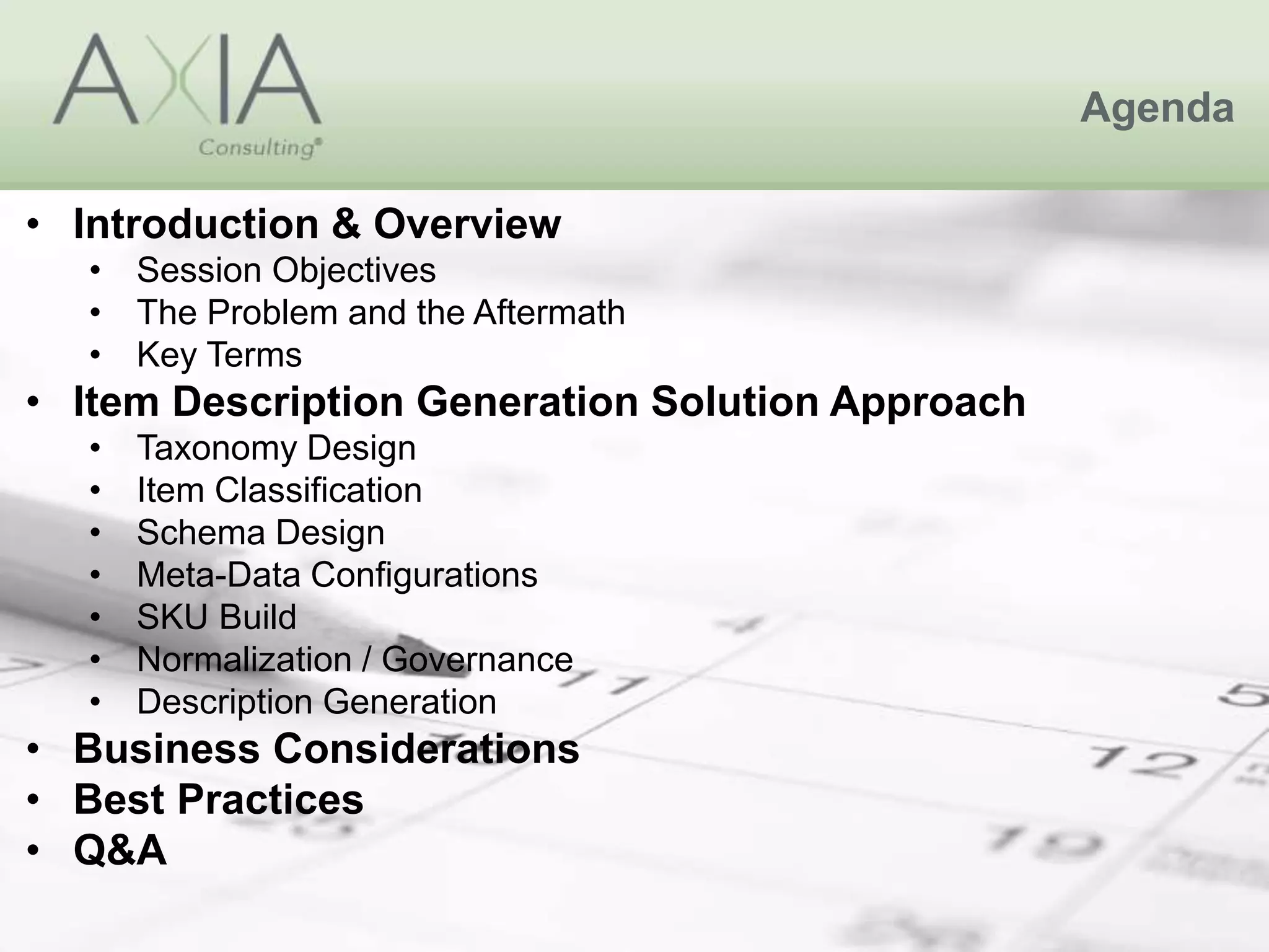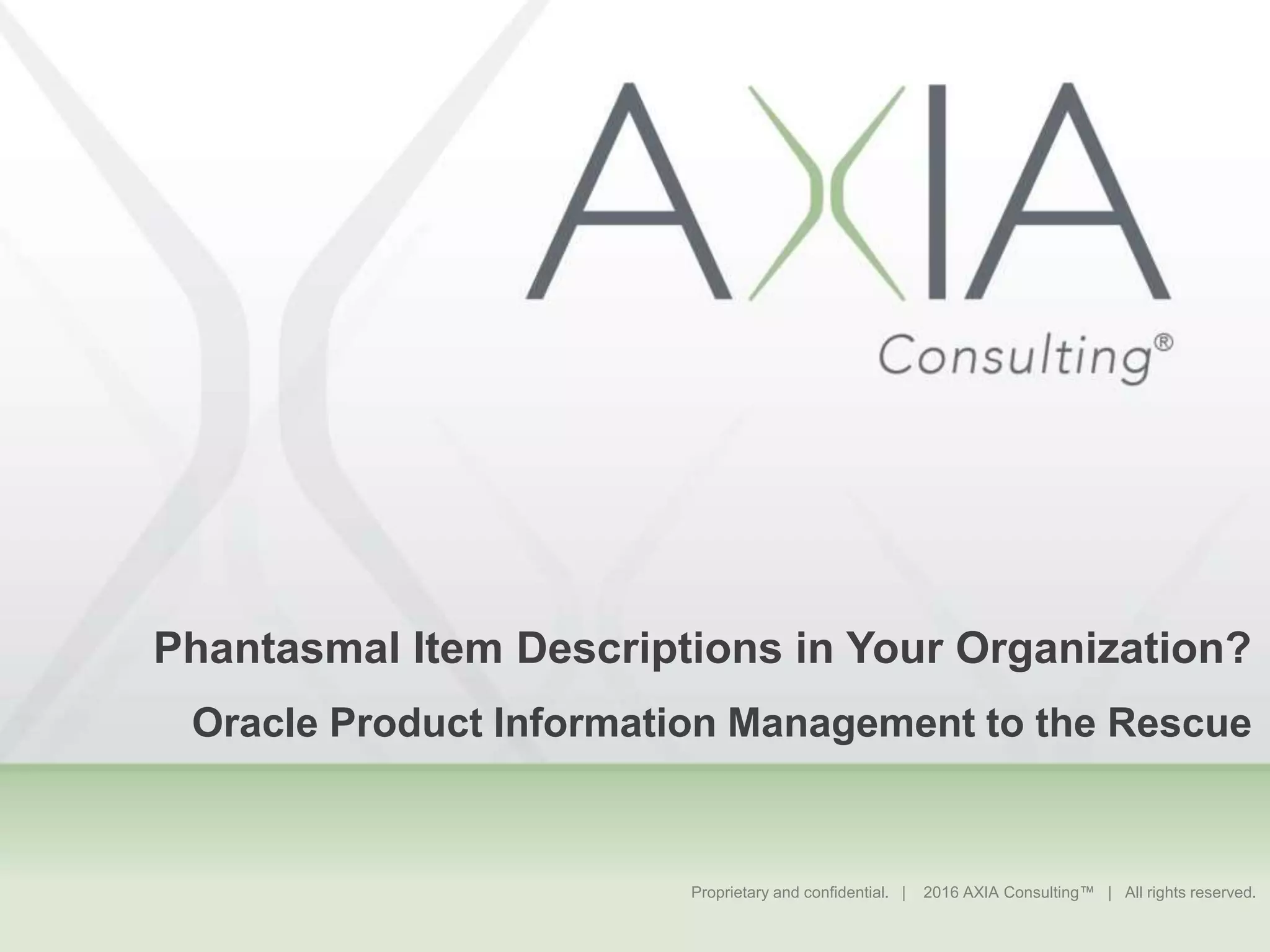 The document outlines a session on improving item descriptions using Oracle Product Information Management (PIM), highlighting issues with 'phantasmal' item data standards, taxonomy, and schema design. It provides a comprehensive approach to creating consistent item descriptions, including taxonomy design, item classification, and best practices for implementation. Additionally, Axia Consulting is introduced as an experienced partner supporting global clients with business and technology solutions.