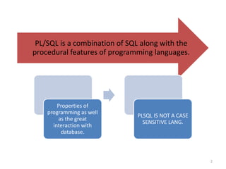 PL/SQL is a combination of SQL along with procedural programming features. It allows developers to perform operations on data in an Oracle database such as querying, inserting, updating, and deleting. Some key PL/SQL concepts include variables, conditions, loops, exceptions, triggers, stored procedures, and cursors. Cursors allow a program to retrieve multiple rows from a SQL statement and process them one by one.