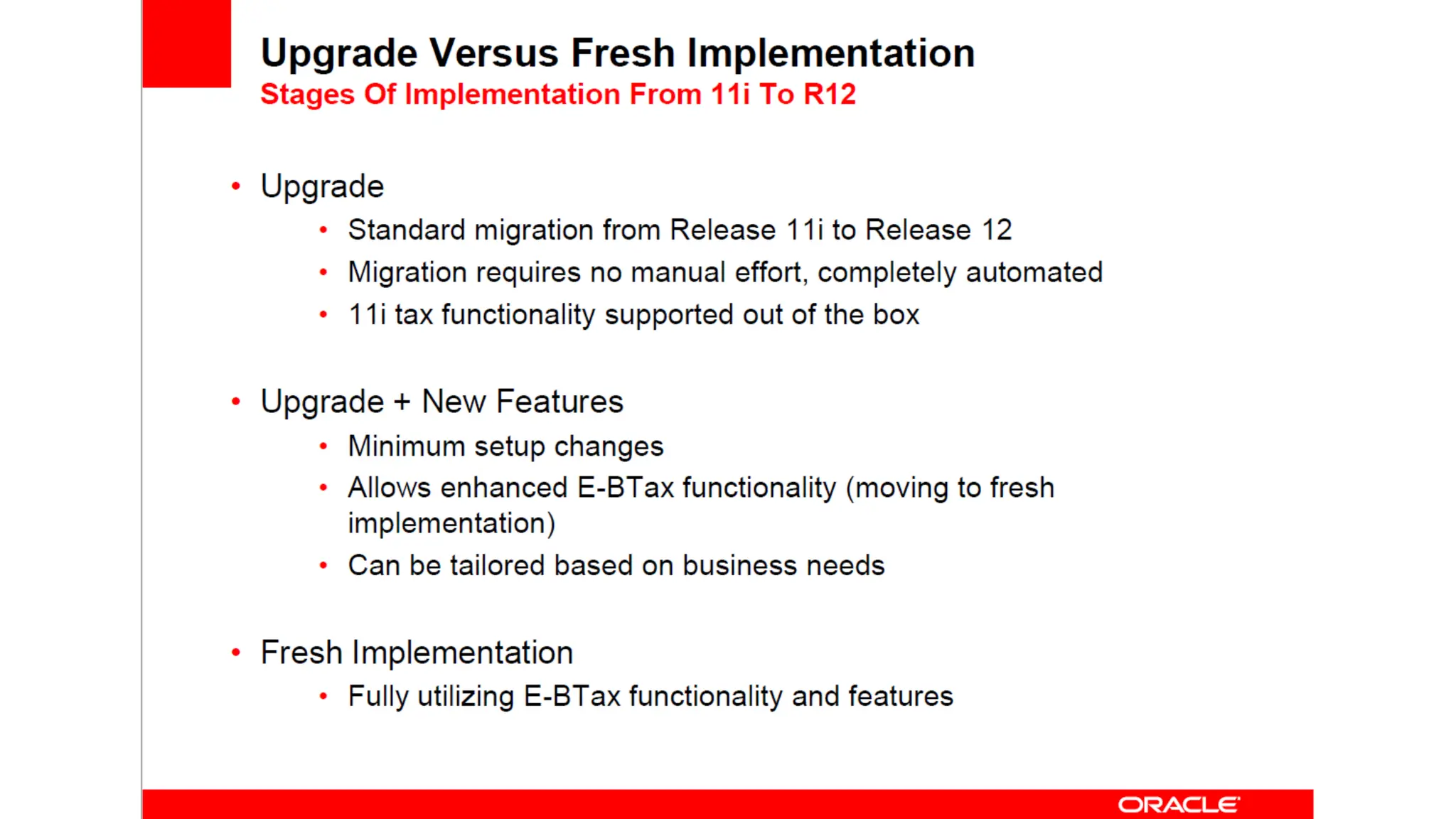 Option 1: UpgradeE- Business Tax Configuration Option 2: Reconfigure E- Business Tax