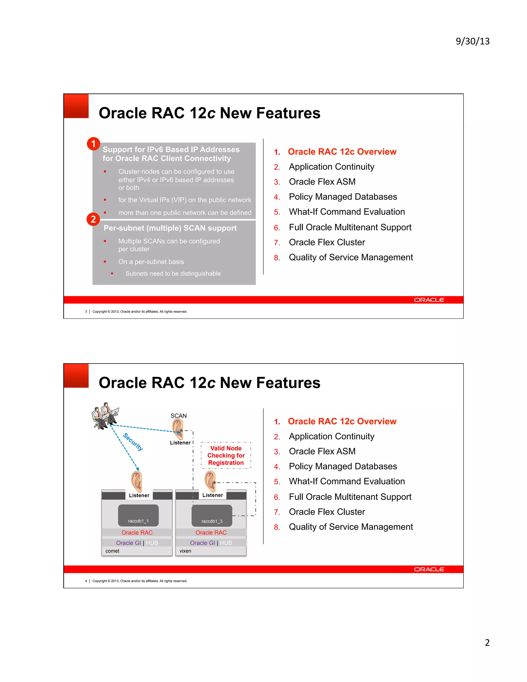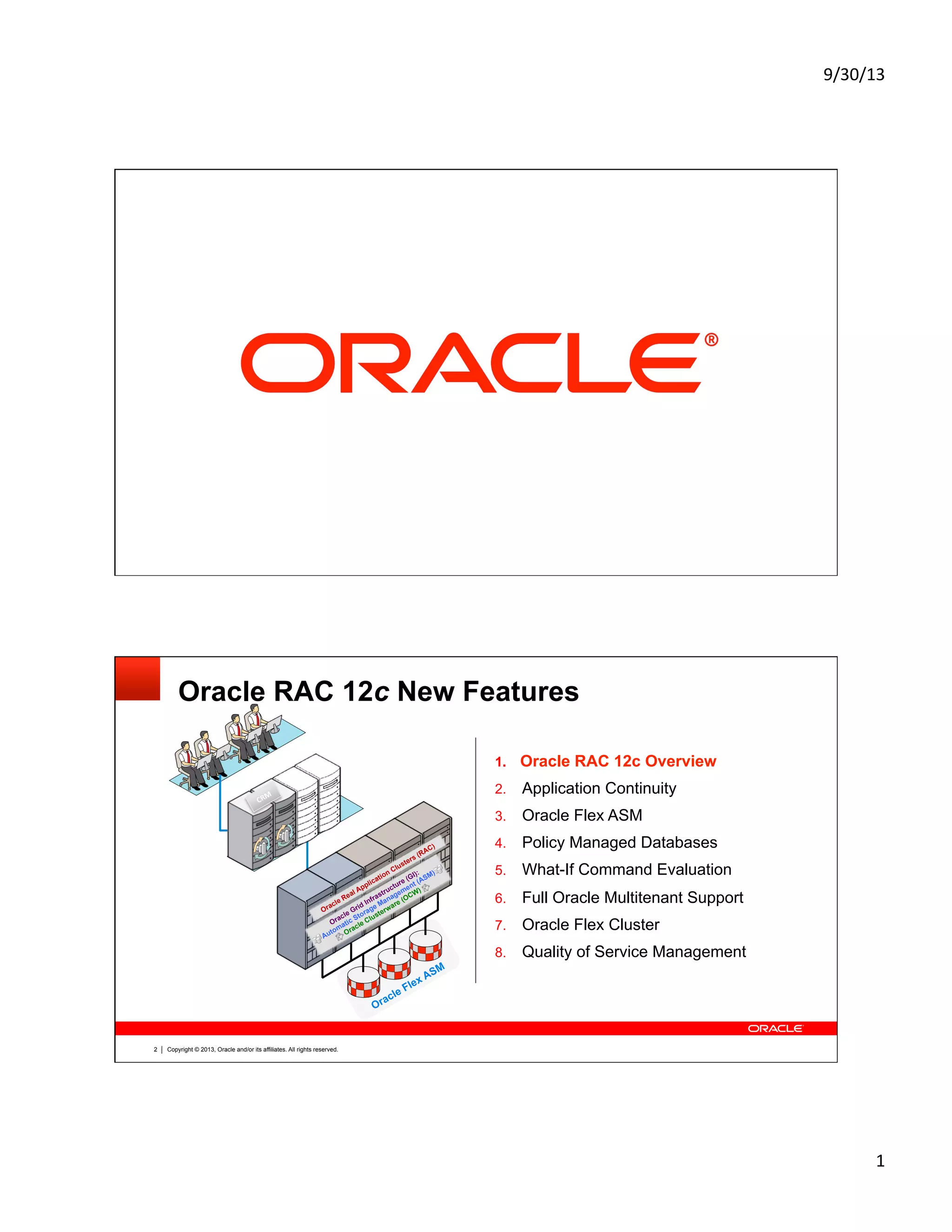 The document outlines the new features of Oracle RAC 12c, including support for IPv6, application continuity, Oracle Flex ASM, policy-managed databases, and full Oracle multitenant support. It also discusses the clustering capabilities, quality of service management, and various management commands associated with these features. The material is aimed at providing a comprehensive overview of Oracle's real application clusters and their enhancements.