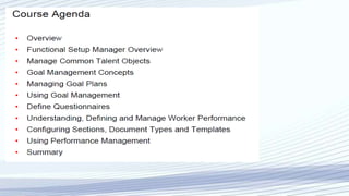 Oracle HCM Cloud is a comprehensive human resource solution that integrates HR processes from recruitment to retirement, improving data consistency and decision-making across the enterprise. It combines features like global HR, talent management, and payroll within a unified cloud system. The platform also supports goal and performance management, offering tools for career development, succession planning, and workforce management.