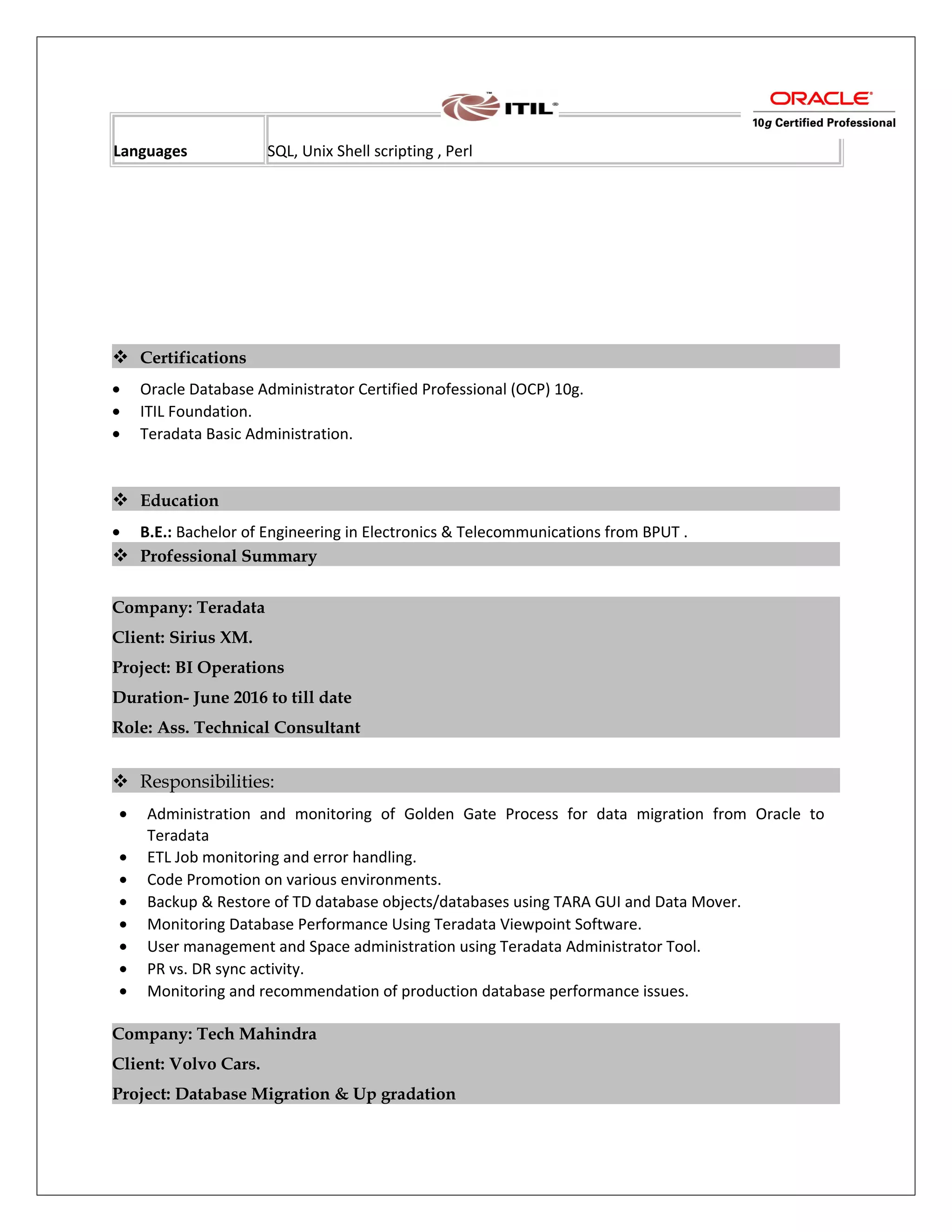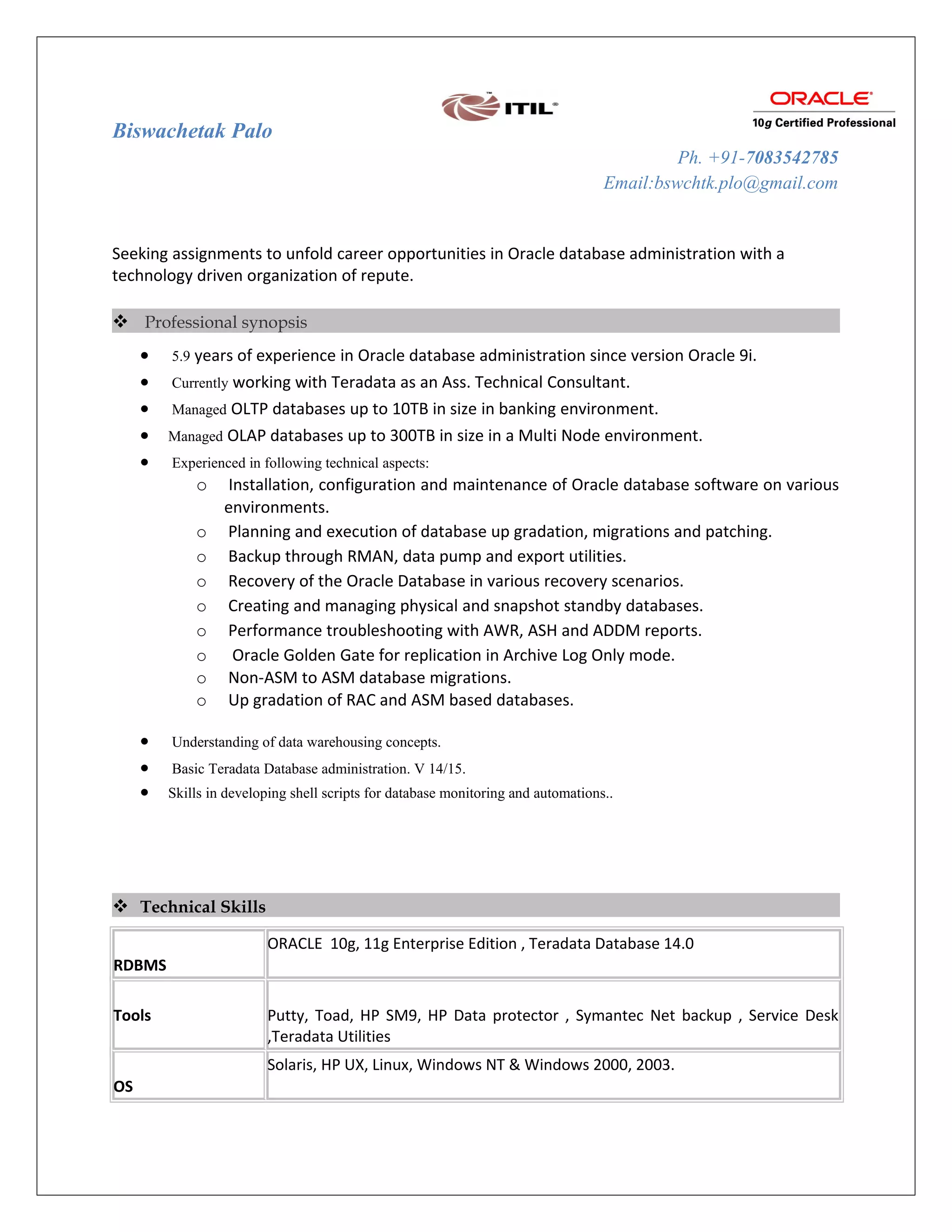 Biswachetak Palo is seeking opportunities in Oracle database administration. He has over 5 years of experience administering Oracle databases from version 9i to the current versions. He has experience managing databases up to 10TB and 300TB in size across banking, telecommunications, and automotive industries. His skills include Oracle installation, configuration, maintenance, upgrades, backups, recovery, performance tuning, and replication. He is Oracle DBA certified and also has experience with Teradata administration.