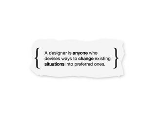 The document discusses the importance of design and provides examples from Wales. It examines what design is, why it is important, how designers work, and examples of designing, making, and remaking in Wales. The key points are that design is about understanding people, prototyping ideas, and using imagination to solve problems. Designers follow a structured process that involves understanding needs, observing interactions, testing ideas, and remaking designs to improve them.