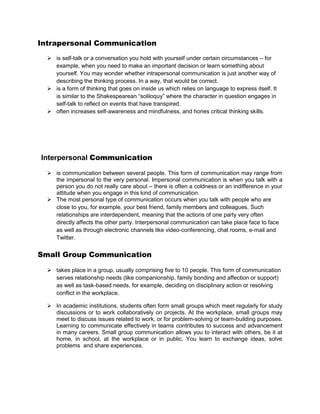 Oral communication refers to any interaction that uses spoken words and includes non-verbal elements like body language and tone. It encompasses skills like coherent speaking, listening, and understanding verbal and non-verbal cues. There are several forms of oral communication, including intrapersonal communication (self-talk), interpersonal communication (between individuals), small group communication, public communication, mass communication, corporate communication, and intercultural communication. The process of oral communication involves identifying the audience's needs, using clear speaking and active listening skills, and ensuring the message is understood.