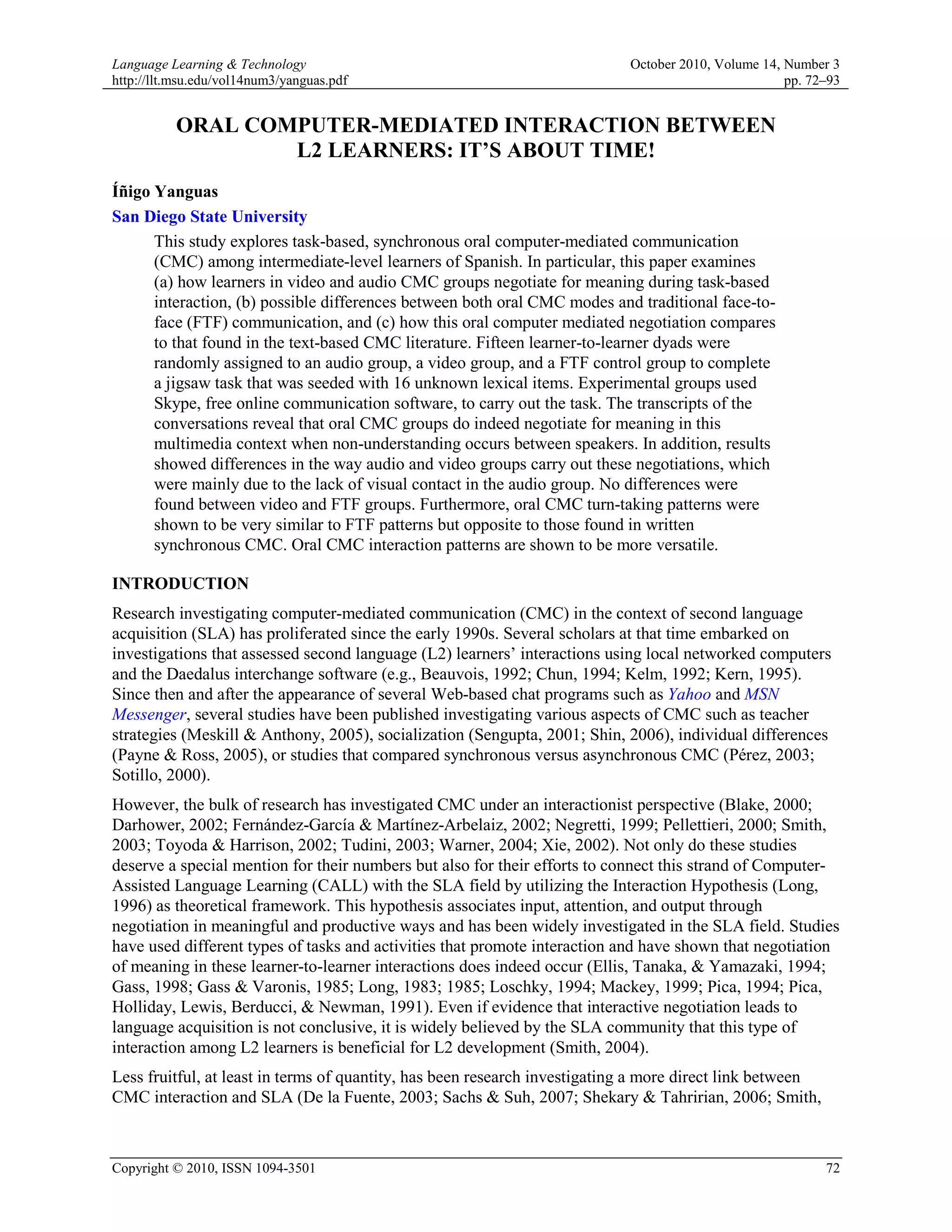This study investigates the oral computer-mediated communication (CMC) between L2 Spanish learners, focusing on how they negotiate meaning during task-based interactions in audio and video formats compared to traditional face-to-face communication. The findings reveal that learners engaged in both oral CMC modes actively negotiate meaning, though differences exist in negotiation strategies due to the lack of visual cues in audio CMC. Overall, the study suggests that oral CMC, particularly through platforms like Skype, can be a beneficial tool for language learning, warranting further exploration in the classroom context.