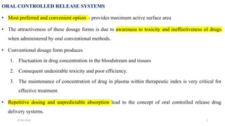 The document discusses the development and mechanisms of oral controlled release drug delivery systems, highlighting their advantages over conventional dosage forms. It categorizes these systems into continuous release, delayed transit and continuous release, and delayed release systems, detailing various techniques and materials used for drug delivery. Key mechanisms include dissolution and diffusion controlled systems, as well as innovative formulations that enhance drug stability and efficacy within the gastrointestinal tract.