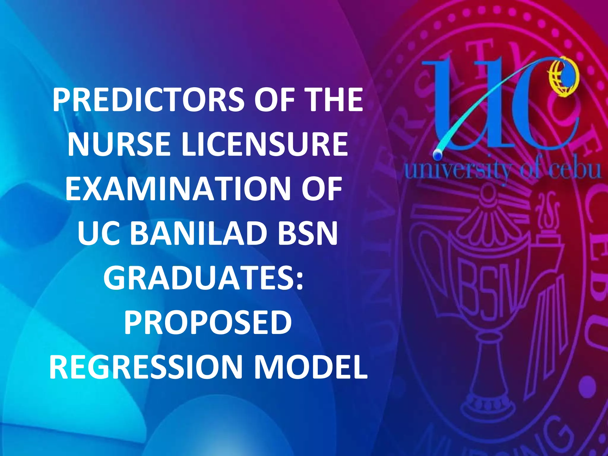 This document presents a study that aimed to identify predictors of performance on the Philippine Nurse Licensure Examination (PNLE) for graduates of the University of Cebu (Banilad) Bachelor of Science in Nursing program. The study found that Revalida Examination ratings and Mock Board Examination ratings were positively correlated with PNLE ratings. A regression model is proposed to predict PNLE performance based on these examinations. The study recommends using the regression model and enhancing review programs to improve exam performance.