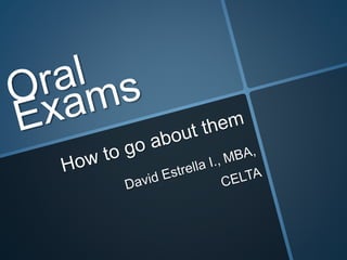 This document discusses considerations for oral exams and evaluating students' speaking skills. It provides examples of different types of speaking tasks that could be used for exams, including one-way tasks like describing experiences and two-way tasks like role plays and discussions. Some characteristics of good speaking tasks are outlined, such as replicating real-life language use and allowing students to contribute equally. The document also provides rubrics and criteria that could be used to evaluate students' pronunciation, fluency, structure, vocabulary, and comprehension. Suggestions are made to focus on these language features when grading oral exams.