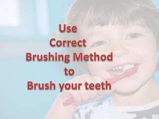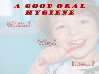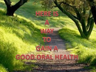 This document provides information about maintaining good dental health and hygiene. It discusses the primary causes of common dental problems like tooth decay and gum disease. It also outlines steps for proper brushing and cleaning techniques, including using a medium toothbrush and fluoridated toothpaste twice daily, changing the toothbrush every three months, and gargling after meals. The document recommends visiting the dentist at least once every six months for checkups and professional dental care.