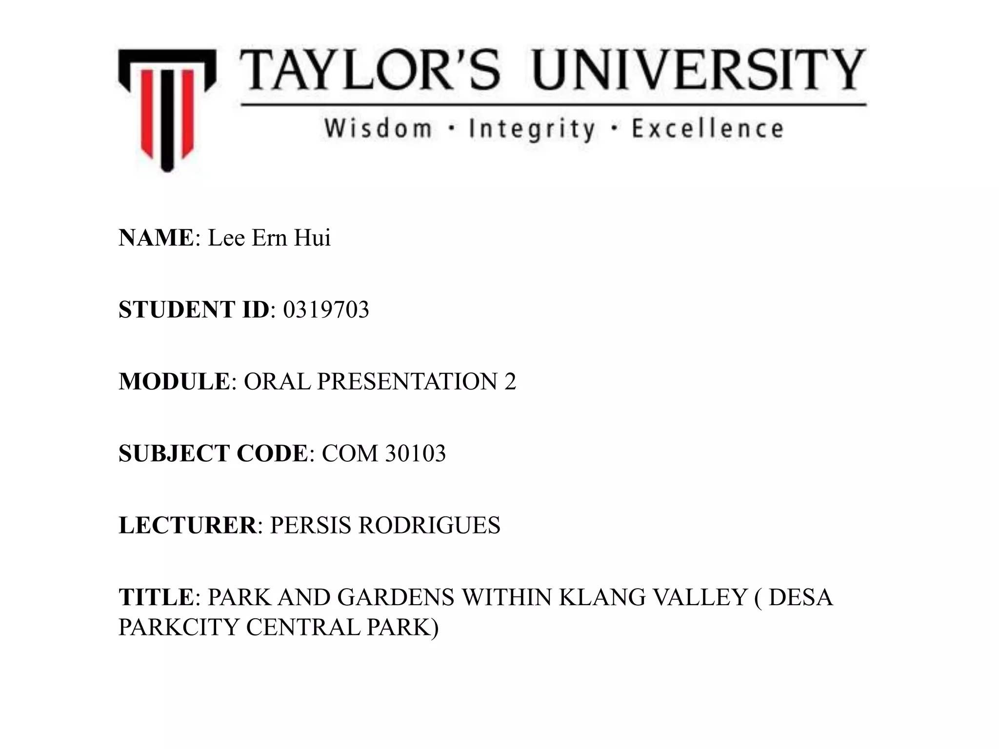 This document provides information about Desa Park City Central Park located in Klang Valley, Malaysia. It summarizes that Desa Park City was developed on a 473 acre abandoned quarry site and was master planned to appeal to modern Malaysian families. The central park within Desa Park City features tree-lined walking paths up to 2.3 km long, children's playgrounds, picnic areas, an iconic lake, and facilities for activities like basketball, dog walking, and cafes/stalls. Materials used to construct aspects of the park include steel, wood, concrete, stones, and bricks.
