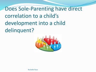 Rochelle Paice presented on whether sole-parenting has a direct correlation to a child becoming delinquent. The presentation covered the topic of single parenting, the research design which included Rochelle's study, instrument used, and external factors considered. Data analysis was presented along with implications for the community and health professionals. The presentation concluded with a question time.