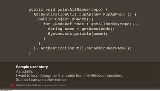 This document discusses using Clojure to interact with the Alfresco content management system. It provides an example of using Clojure to loop through all nodes in the Alfresco repository and print their names. It then explores translating the Java code into an idiomatic Clojure implementation using features like macros, immutable data structures, and Clojure's powerful seq library for processing sequences. The document aims to illustrate how a functional programming language like Clojure can provide benefits for working with Alfresco.
