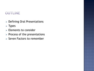 This document defines oral presentations and discusses their key elements and factors. It covers the different types of presentations; elements to consider like purpose, audience and content; and the process from planning to delivery. It provides seven factors for effective delivery, including starting confidently, understanding audience mood, using proper voice, body language, visual aids, timing, and concluding strongly.