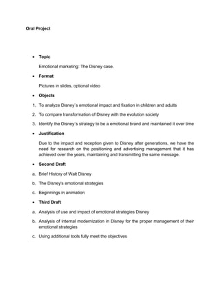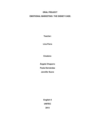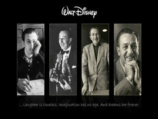 Walt Disney had a lonely childhood without parental support which led him to spend a lot of time dreaming and drawing. The document discusses analyzing the emotional strategies used in Disney films and the company's internal modernization efforts to properly manage these strategies, suggesting additional tools to fully meet objectives.