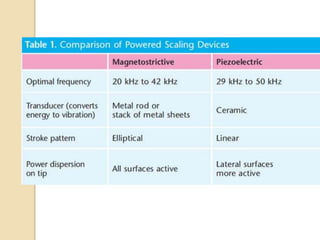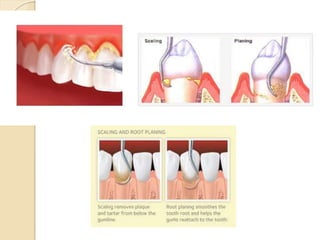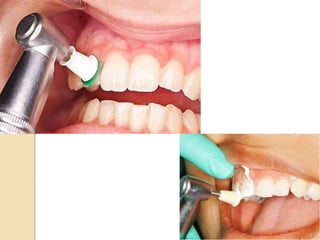 Oral prophylaxis, also known as teeth cleaning, is a dental procedure that removes plaque and tartar from tooth surfaces. It is generally performed using a scaler instrument to remove buildup above and below the gumline. Regular cleanings every 6 months are recommended for patients with good oral health to prevent periodontal disease. For patients with gum disease, a deeper cleaning called scaling and root planing is needed to remove tartar and bacteria from deep under the gums. The cleaning procedure involves removing supragingival and subgingival deposits using both hand instruments and ultrasonic scalers, followed by polishing, fluoride treatment, and home care instructions.