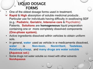 This document discusses pharmaceutical oral solutions. It begins by explaining that oral solutions are homogeneous liquid preparations containing one or more completely dissolved active ingredients. They provide rapid absorption and are particularly useful for patients who have difficulty swallowing solid dosage forms. The document then defines pharmaceutical solutions as preparations where active ingredients and excipients are dissolved in a solvent system. It discusses the types of excipients commonly used in solutions, including vehicles, co-solvents, preservatives, and viscosity modifiers. The document outlines factors that can affect drug solubility and methods to enhance it, such as salt formation, pH adjustment, and use of co-solvents. It also discusses formulation of solutions and common excipients used in oral solutions.