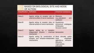 Local anaesthesia is defined as a reversible loss of sensation in a circumscribed area caused by depressing nerve excitation or inhibiting peripheral nerve conduction. It can be induced by low temperature, trauma, anoxia, neurolytic agents like alcohol and phenol, or chemical agents like local anaesthetics. Local anaesthetics work by altering the nerve membrane's resting potential, threshold potential, rate of depolarization, or rate of repolarization. They are available as salts and can exist as uncharged molecules or positively charged ions depending on pH. Local anaesthetics contain the active agent, a vasoconstrictor to decrease absorption, a reducing agent for stability, a preservative, and a vehicle for isotonicity. They are classified based