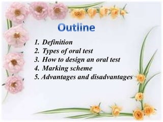 The document outlines how to design an effective oral exam. It discusses defining the purpose and objectives, determining the test format such as individual, paired, or group tasks, designing questions on a variety of topics, using visual aids like pictures to elicit responses, developing a scoring rubric focused on fluency and accuracy, and considering both the advantages of personalizing the assessment but also the challenges of standardization and objectivity.