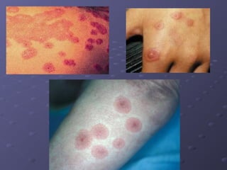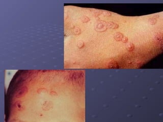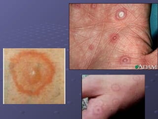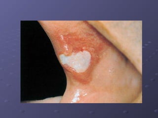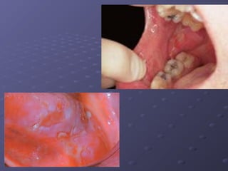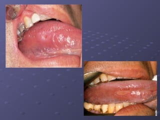 This document describes various types of oral lesions including macules, papules, plaques, vesicles, bullae and pustules. It then discusses important causes of oral mucosal ulcers, separating them into those that involve preceding vesiculation like herpes simplex, herpes zoster, chickenpox, hand-foot-and-mouth disease and herpangina, and those without preceding vesiculation such as cytomegalovirus, tuberculosis, syphilis, traumatic ulcers, aphthous stomatitis, Behcet's disease, Reiter's syndrome, lichen planus and some mucosal drug reactions. Specific features of each condition are described in detail with examples