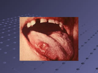 This document discusses oral ulcers caused by various infectious and non-infectious conditions. It describes the clinical features and management of several specific conditions that can cause oral ulcers, including herpes simplex virus infections (primary and recurrent), varicella-zoster virus infections (chickenpox, herpes zoster), hand-foot-and-mouth disease, herpangina, tuberculosis, and syphilis. For each condition, it covers the presentation of oral ulcers, pathogenesis, diagnosis, and treatment approaches.