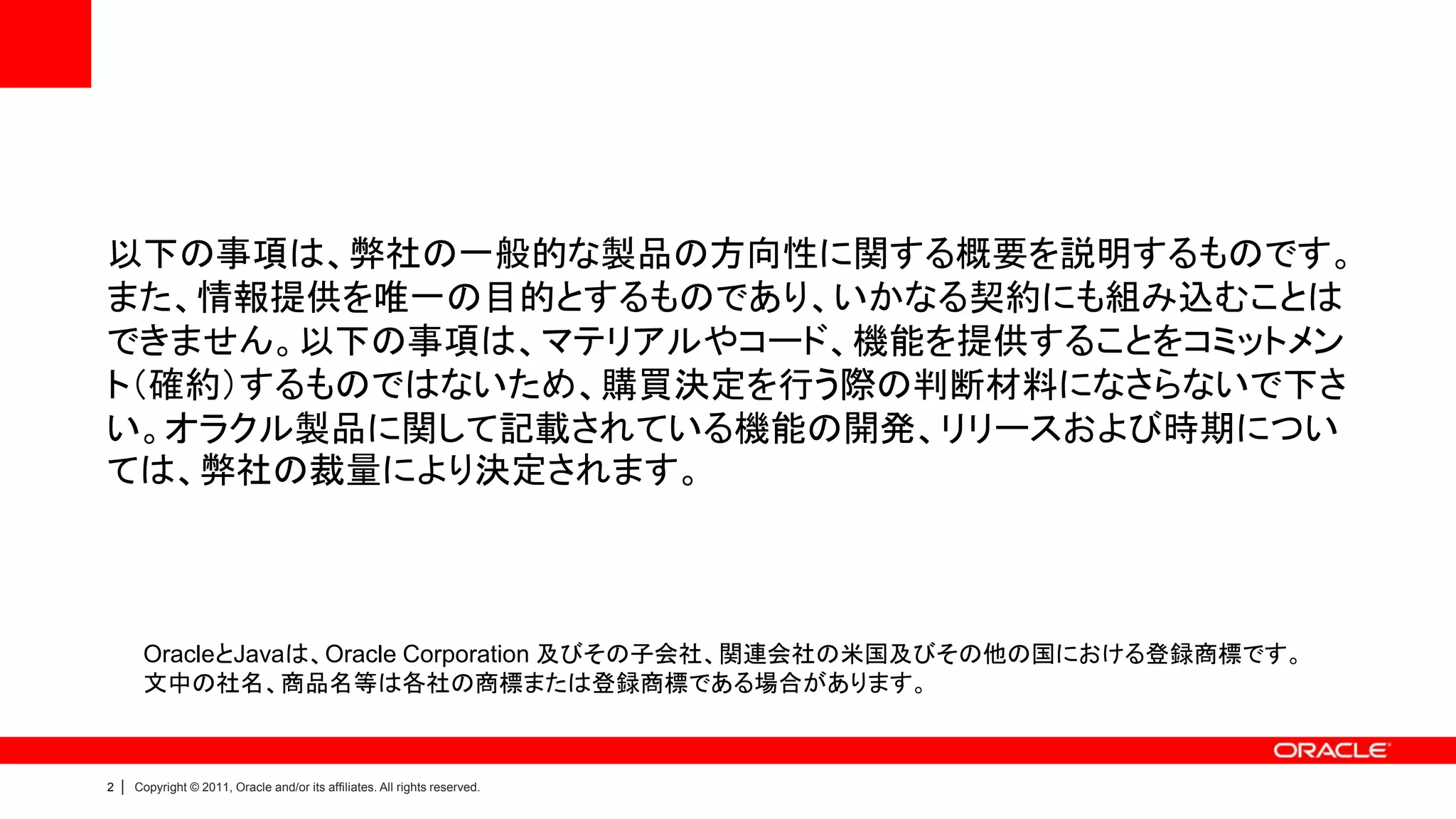 >クラウドのために構築 >エンタープライズ アプリケーションに最適 >Oracleのためにエンジニアされた 21 | Copyright © 2011, Oracle and/or its affiliates. All rights reserved.