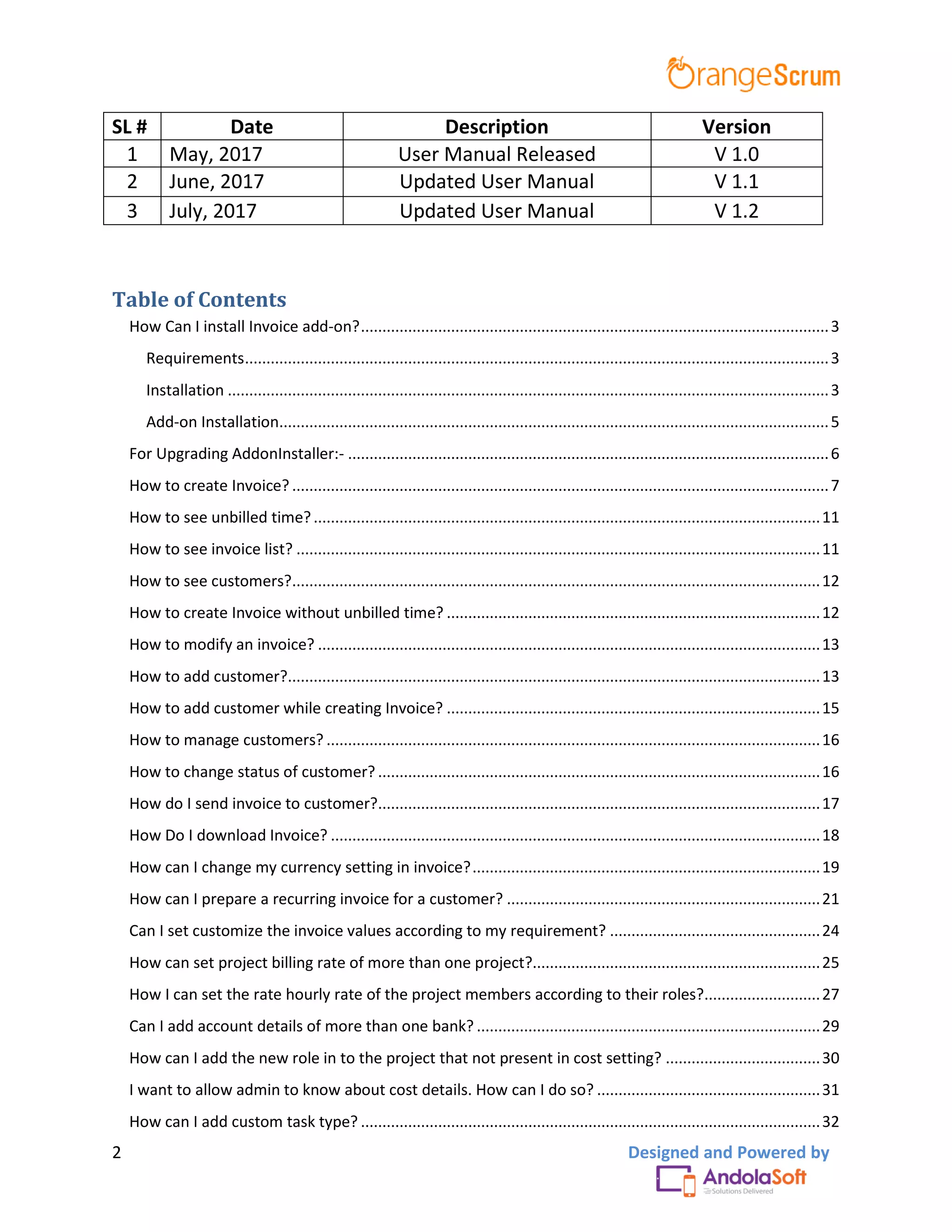 The user manual version 1.2 provides comprehensive instructions on how to install and use the invoice add-on, including prerequisites, installation steps, and various functionalities such as creating and modifying invoices, managing customers, and adjusting settings. Additional information covers recurring invoices, customizing invoice values, and handling billing rates. The manual also addresses troubleshooting during installation and specific actions users can perform related to invoices and customers.