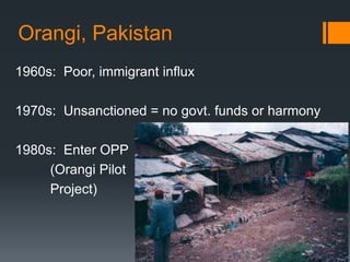 The Orangi project involved local communities in planning and installing basic sanitation infrastructure without government funds. It promoted simple, affordable technologies and built local capacity through social organizers. The Gal Oya project aimed to increase rice production through irrigation but displaced indigenous groups and caused ethnic tensions by favoring Sinhalese settlers over Tamils. Both projects provide lessons about participatory development and whose interests are being served by different approaches.