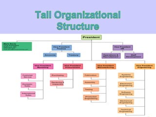 The document outlines the structure and organization principles of Telenor Pakistan, highlighting its mechanistic and functional hierarchy aimed at achieving business goals. It discusses different organizational structures, the company's operations in the Pakistani telecommunications market since 2005, and various products and services tailored to customer needs. Additionally, it emphasizes Telenor's economic contributions and investments in infrastructure expansion to enhance its operational capabilities.