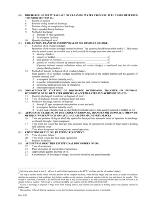 The document provides detailed instructions for recording machinery space operations in the Oil Record Book Part I and cargo/ballast operations in Part II, as mandated by MARPOL 73/78 regulations. It outlines the required information for entries including tank identities, operational codes, and circumstances of oil discharge, emphasizing the need for accuracy and proper documentation. Both sections stipulate that the records must be signed by authorized personnel and preserved for three years, with provisions for inspection by competent authorities.