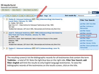 The document provides instructions for searching the Fortunoff Video Archive catalog to find testimonies. It describes both basic and advanced search options. The basic search uses keyword searching and allows combining terms with Boolean operators like "and". An advanced search allows limiting results by field, such as subject. Features like search filters, truncation, and language limits are also covered to help refine results.