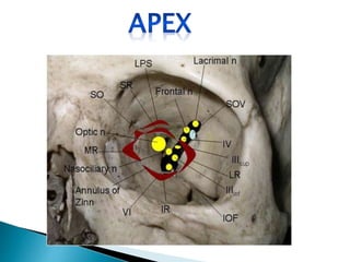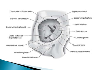 This document describes orbital cellulitis, including its causes, symptoms, potential complications, diagnostic tests, and treatment. Orbital cellulitis is a purulent inflammation of the orbital connective tissue that can be caused by the spread of infection from nearby areas like sinuses or injuries. Symptoms include swelling, eye pain, and vision issues. Without treatment, complications can include abscesses, vision loss, and spread to nearby areas like the brain. Diagnosis involves tests like CT scans and cultures. Treatment consists of broad-spectrum antibiotics, monitoring by multiple specialists, and sometimes surgical drainage or decompression.