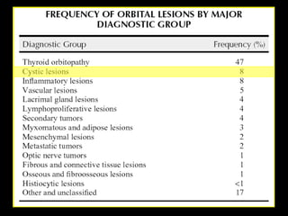 4) Common orbital pathologies discussed include thyroid orbitopathy, dermoid cysts, hematologic cysts, and cholesterol granulomas.