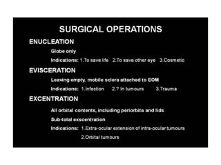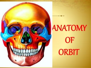 The document provides an overview of orbital anatomy and diseases. It describes the bones that make up the walls of the orbit, as well as the contents of the orbit such as the eyeball, muscles, nerves and blood vessels. Common orbital diseases are discussed including thyroid eye disease, infections, tumors and cysts, and trauma. Clinical evaluation involves assessing features like proptosis, extraocular motility, and imaging studies. Specific conditions like dermoid cysts, hemangiomas and fractures are also outlined.