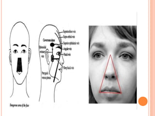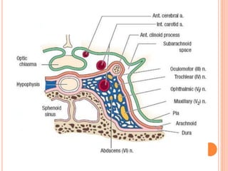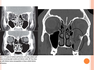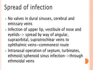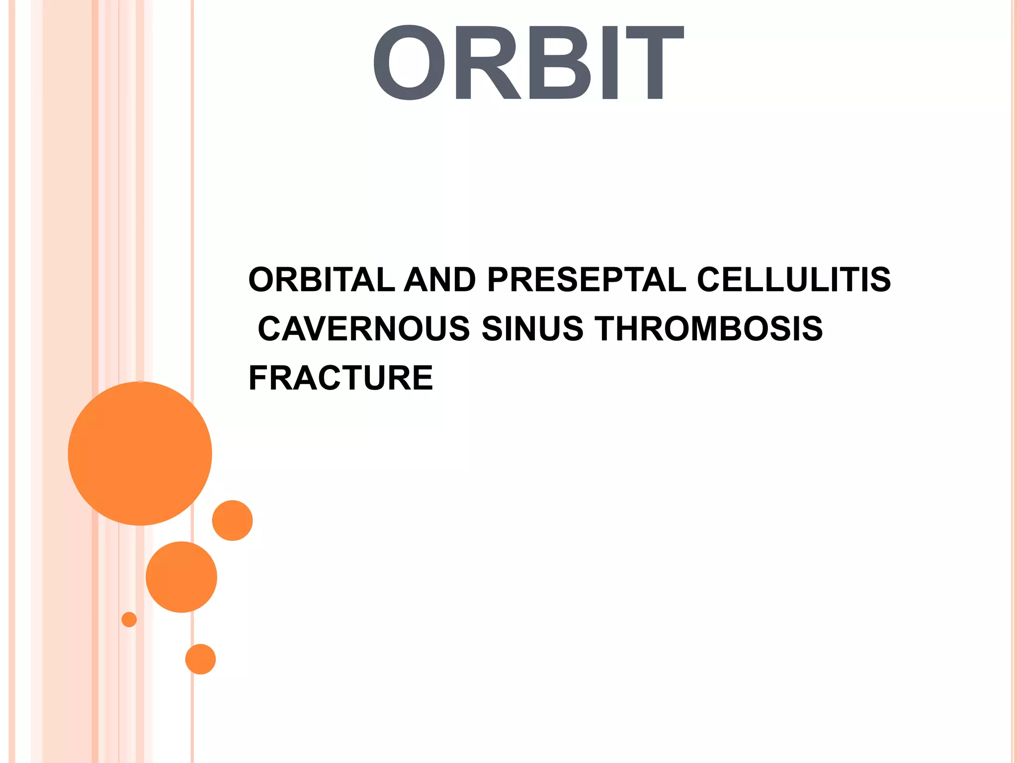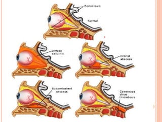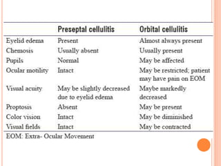 The orbit is separated from the eyelid by the orbital septum, which prevents spread of infection from the eyelids to the orbit. Preseptal cellulitis involves infection of tissues anterior to the septum, causing eyelid swelling and pain but no orbital involvement. Orbital cellulitis is infection behind the septum in the orbit, which can lead to complications like abscesses, cavernous sinus thrombosis, or meningitis if not treated promptly with IV antibiotics. Cavernous sinus thrombosis involves septic thrombosis of the cavernous sinus veins and can cause bilateral proptosis, cranial nerve palsies, and systemic symptoms. Facial trauma can cause fractures of the orbital walls which may require surgical