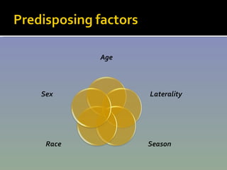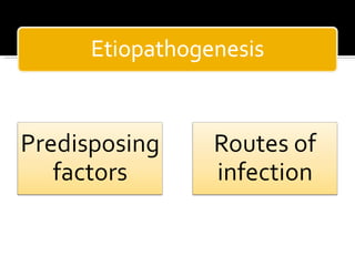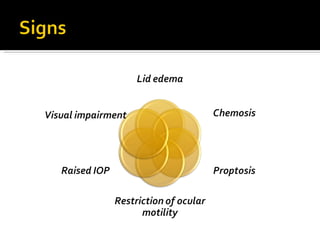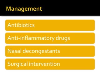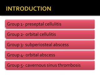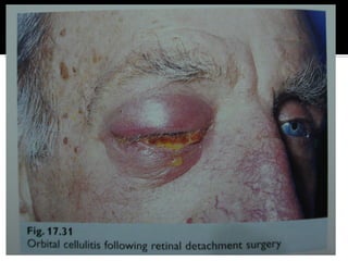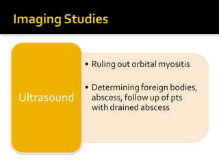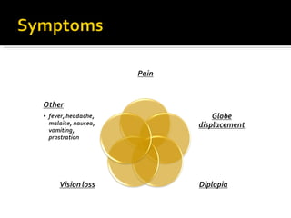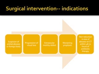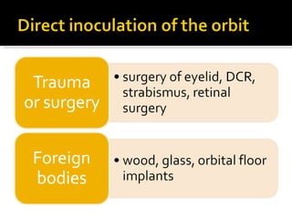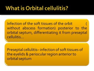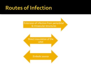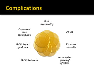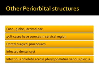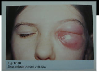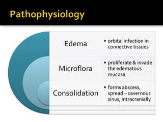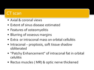 The document discusses the involvement of acute sinusitis in orbital conditions, emphasizing the significance of free vascular communication between the orbit and sinuses. It details the various factors such as orbital fractures, mucoceles, and infections that may lead to orbital cellulitis, along with imaging techniques for diagnosis and treatment planning. Furthermore, it highlights the effectiveness of gadolinium contrast enhancement in evaluating conditions like cavernous sinus thrombosis.