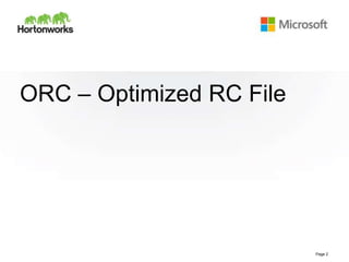 The document discusses the Optimized Row Columnar (ORC) file format, detailing its structure, performance benefits, and integration with Hive to enhance data storage and query performance. It highlights features like vectorization, predicate pushdown, and comparison with other file formats. Preliminary performance results demonstrate significant improvements in query execution times using ORC compared to traditional methods.