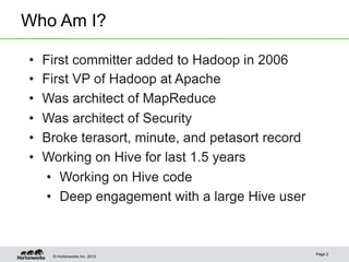 The document provides a technical overview of ORC (Optimized Row Columnar) files, detailing their structure, serialization techniques for different data types, and compression methods. It discusses performance aspects such as query optimization, memory management, and vectorization. Additionally, it compares ORC with other file formats like RC file and Parquet, highlighting various features and advantages.