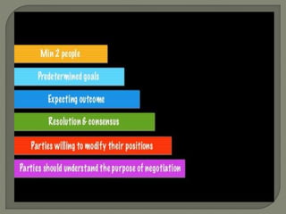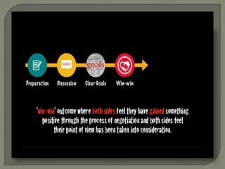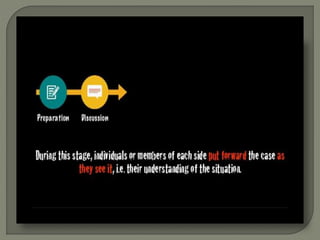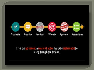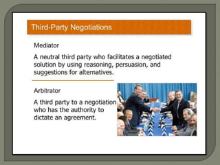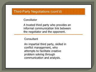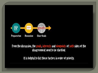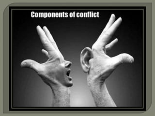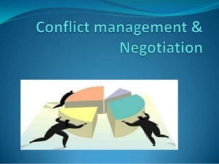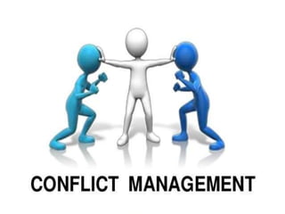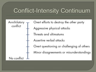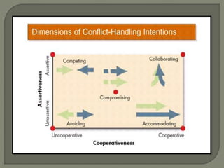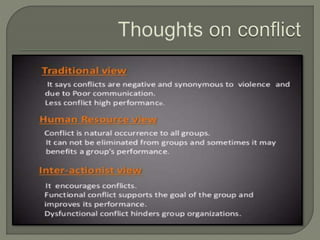 The document discusses conflict in groups and its management. It defines different types of conflict including functional and dysfunctional conflict. Functional conflict supports group goals and performance, while dysfunctional hinders it. The document also outlines various causes of conflict including communication issues, group structure problems, and personal variables. It then discusses five approaches to conflict - competing, collaborating, avoiding, accommodating, and compromising. Finally, it notes potential functional and dysfunctional outcomes of conflict and how to create functional conflict to improve group performance and decision making.