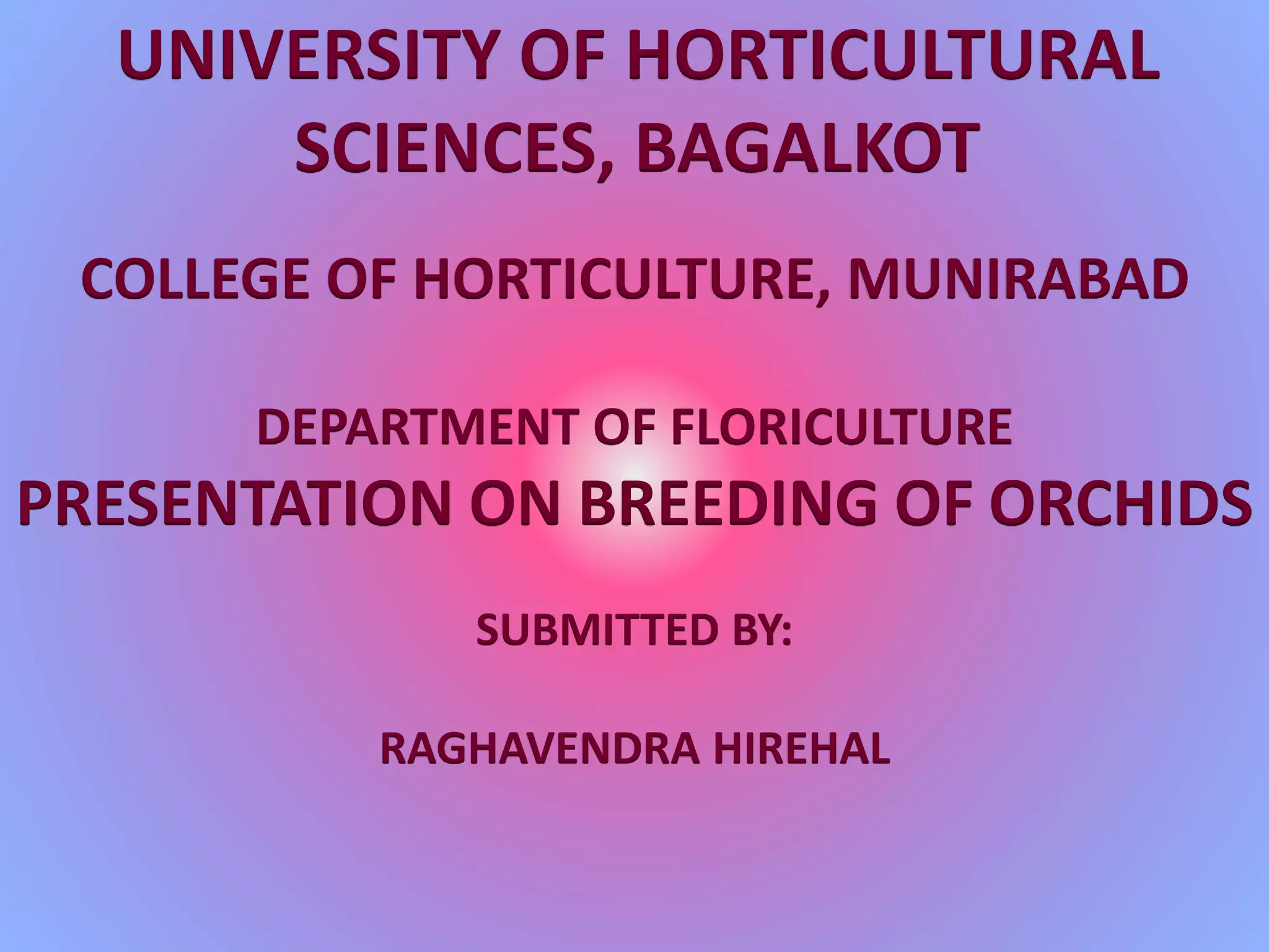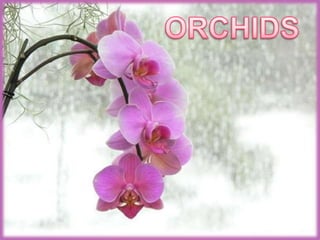 This document provides information on breeding of orchids. It begins with the classification, origin, and description of orchids. It then discusses the vegetative growth, floral biology, and important orchid species. The objectives and methods of orchid breeding are outlined, including hybridization, mutation breeding, polyploidy breeding, and biotechnology. Specific hybrids resulting from these methods are presented for various orchid genera. International ruling varieties are also listed.