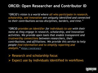 The document discusses ORCID (Open Researcher and Contributor ID), which aims to uniquely identify individuals participating in research and scholarship, enhancing transparency and connection to their contributions. ORCID has launched successfully since 2012, currently serving over 3.25 million IDs with widespread global integration among member organizations. The document emphasizes the necessity of integrating ORCID into research workflows to avoid ambiguity and improve metadata management.